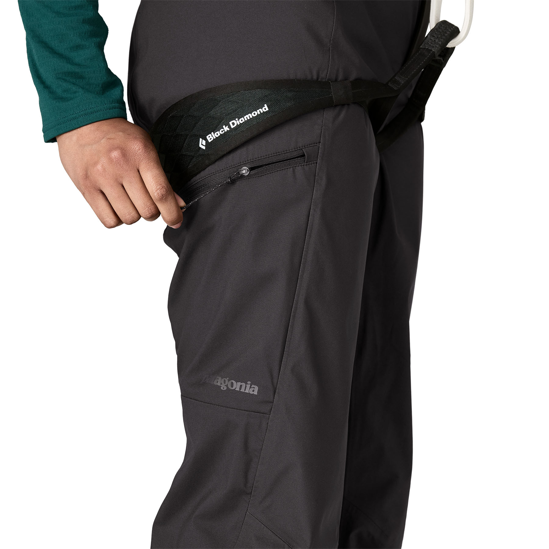 They are compatible with harnesses and alpine suspenders, featuring a low-profile waist closure with a snap and zip fly. The webbing waistbelt fits comfortably under a harness, and discreet laser-cut suspender attachment points are hidden inside the waistband.